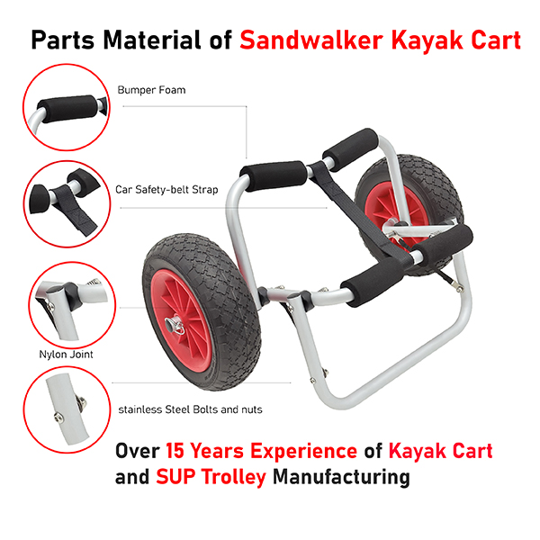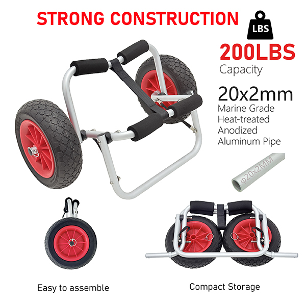 Il carrello Kayak Trolly vanta un robusto telaio in alluminio anodizzato, che non solo ne garantisce la robustezza ma fornisce anche un'eccellente resistenza alla corrosione.