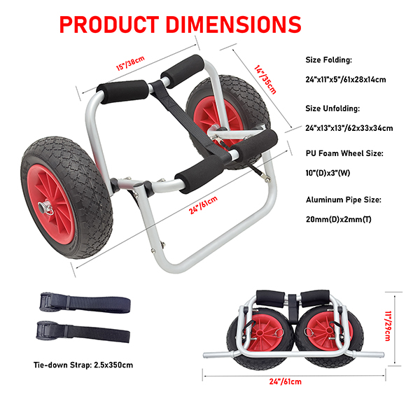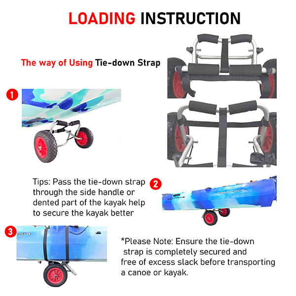 Per proteggere ulteriormente il kayak o la canoa durante il trasporto, il carrello include due cinghie di ancoraggio lunghe 1 pollice per 12 piedi.